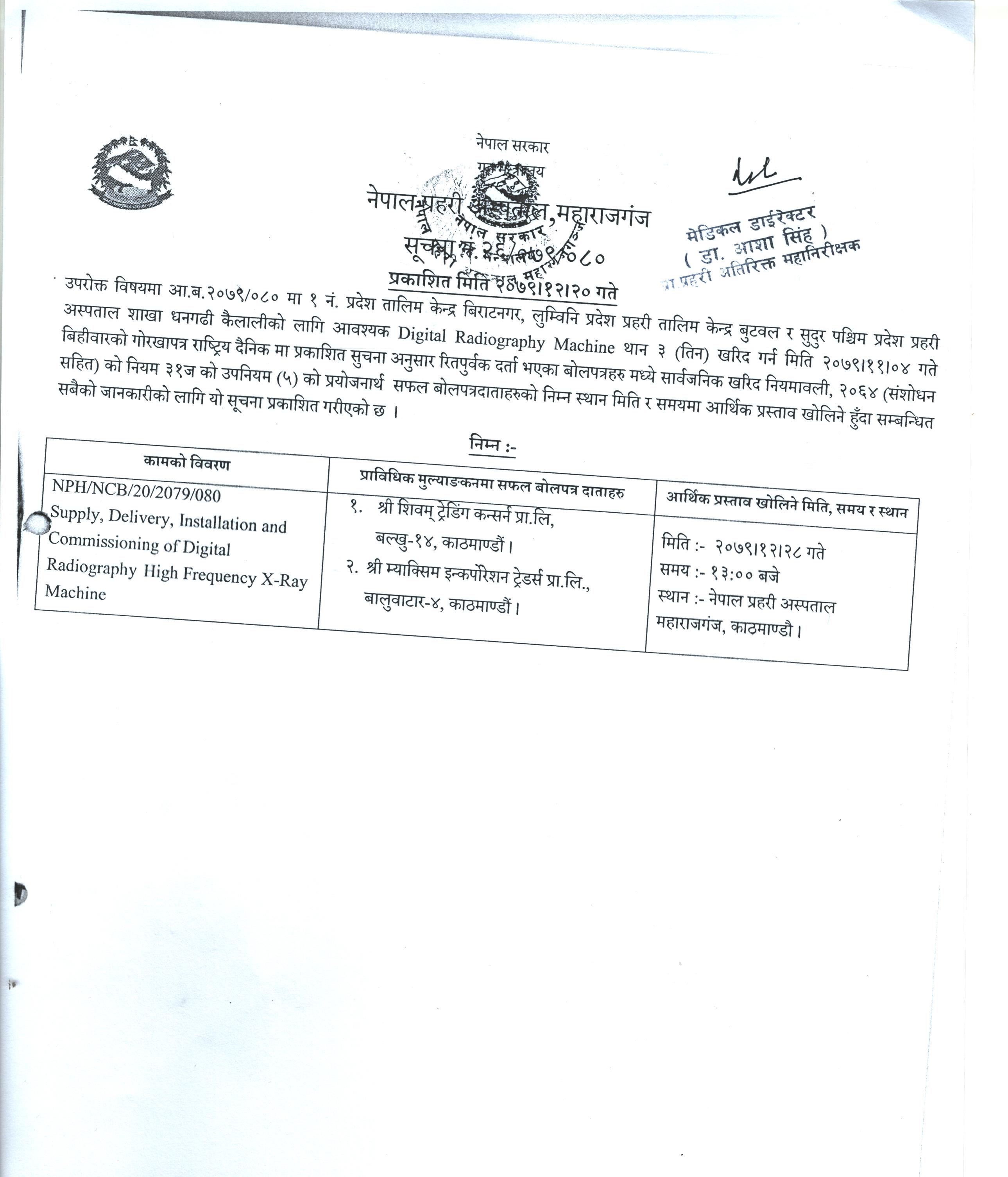 आर्थिक प्रस्ताव खोलिने बारेको सूचना । २०७९-१२-२०