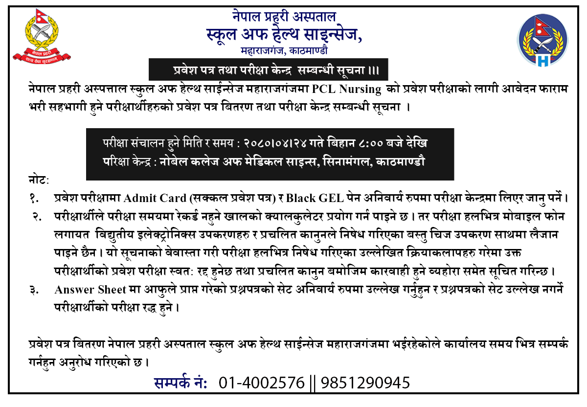PCL Nursing को प्रवेश परीक्षा तथा परीक्षा केन्द्र सम्बन्धी सूचना 2080-04-18