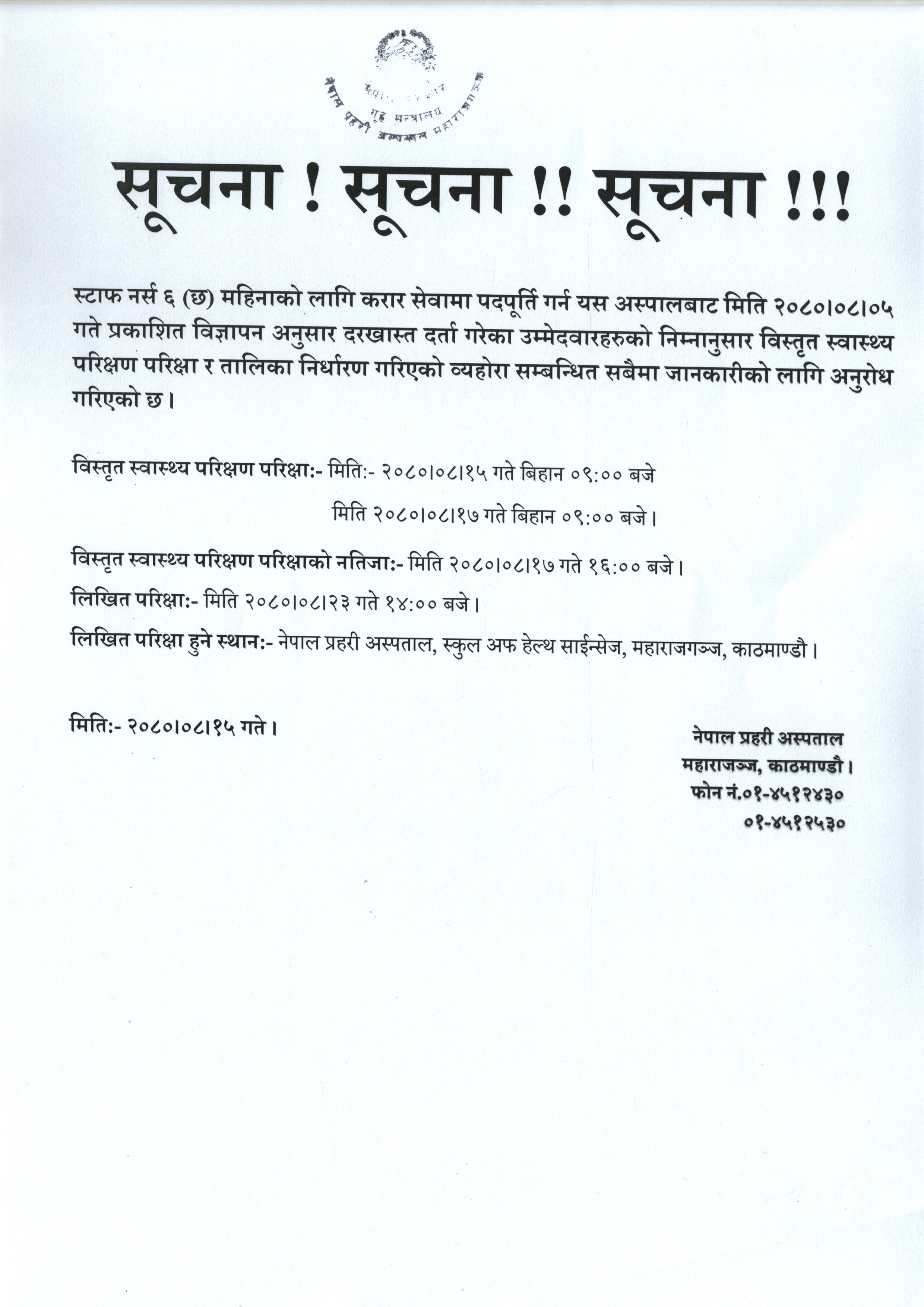स्टाफ नर्स करारको स्वास्थ्य परिक्षण परिक्षा र तालिका सम्वन्धी सूचना ।