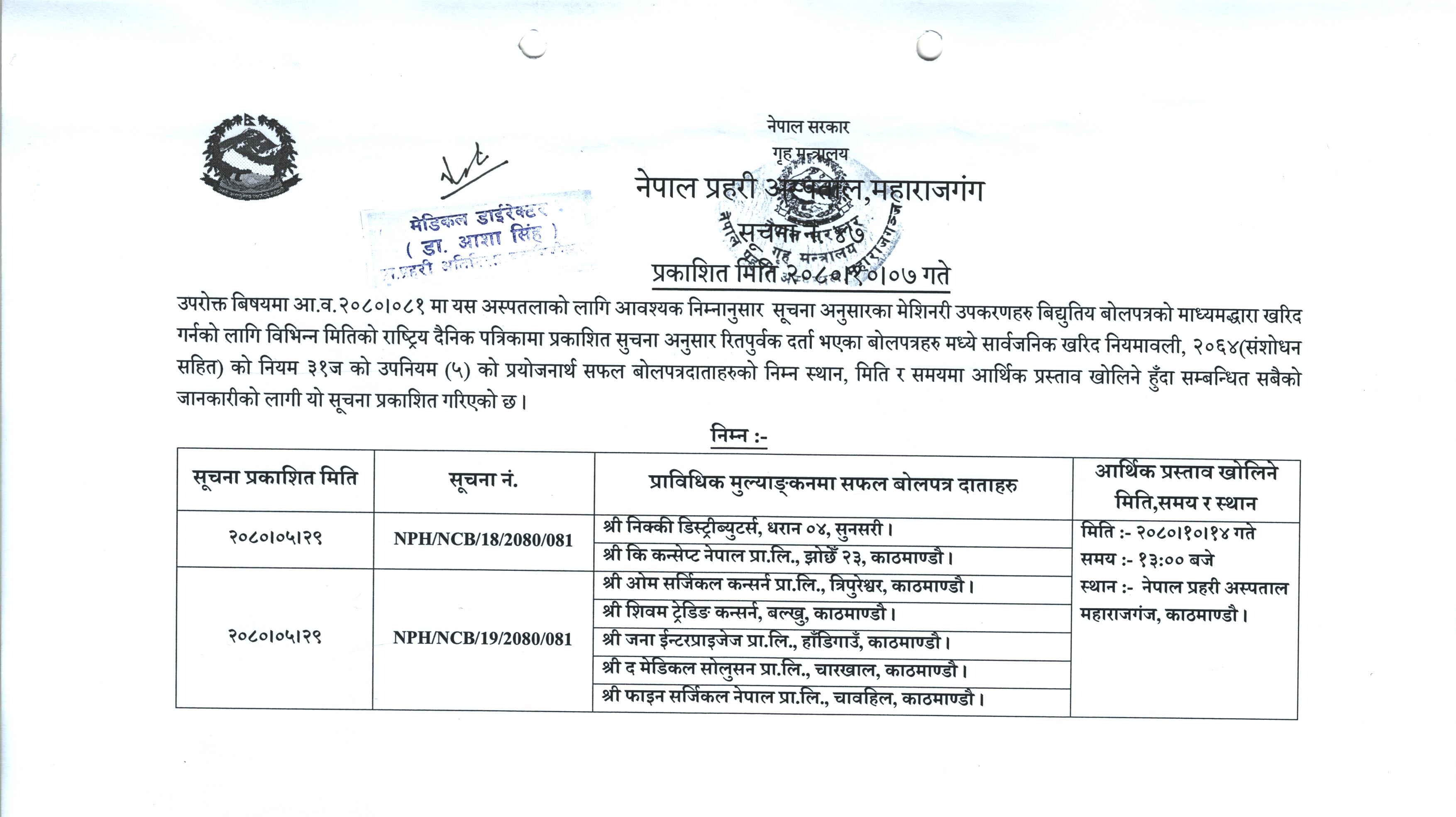 आर्थिक प्रस्ताव खोलिने बारेको सूचना । २०८०-१०-०७ गते ।