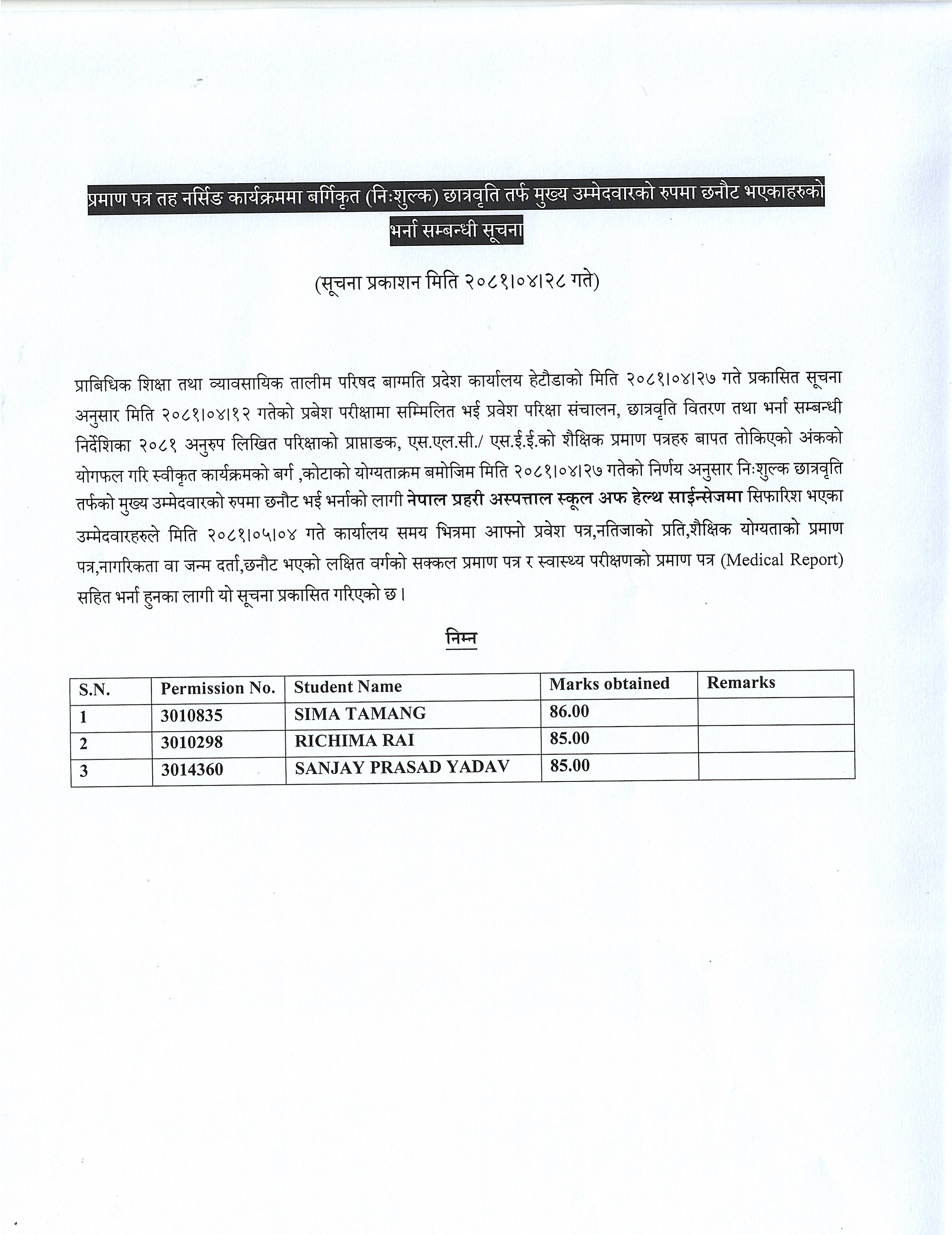 प्रमाण पत्र तह नर्सिङ कार्यक्रममा बर्गिकृत (निःशूल्क) छात्रवृति तर्फ मूख्य उम्मेदवारको रुपमा छनौट भएकाहरुको भर्ना सम्बन्धी सूचना । २०८१/०४/२८ गते 2081-04-28 A A- A+ Share