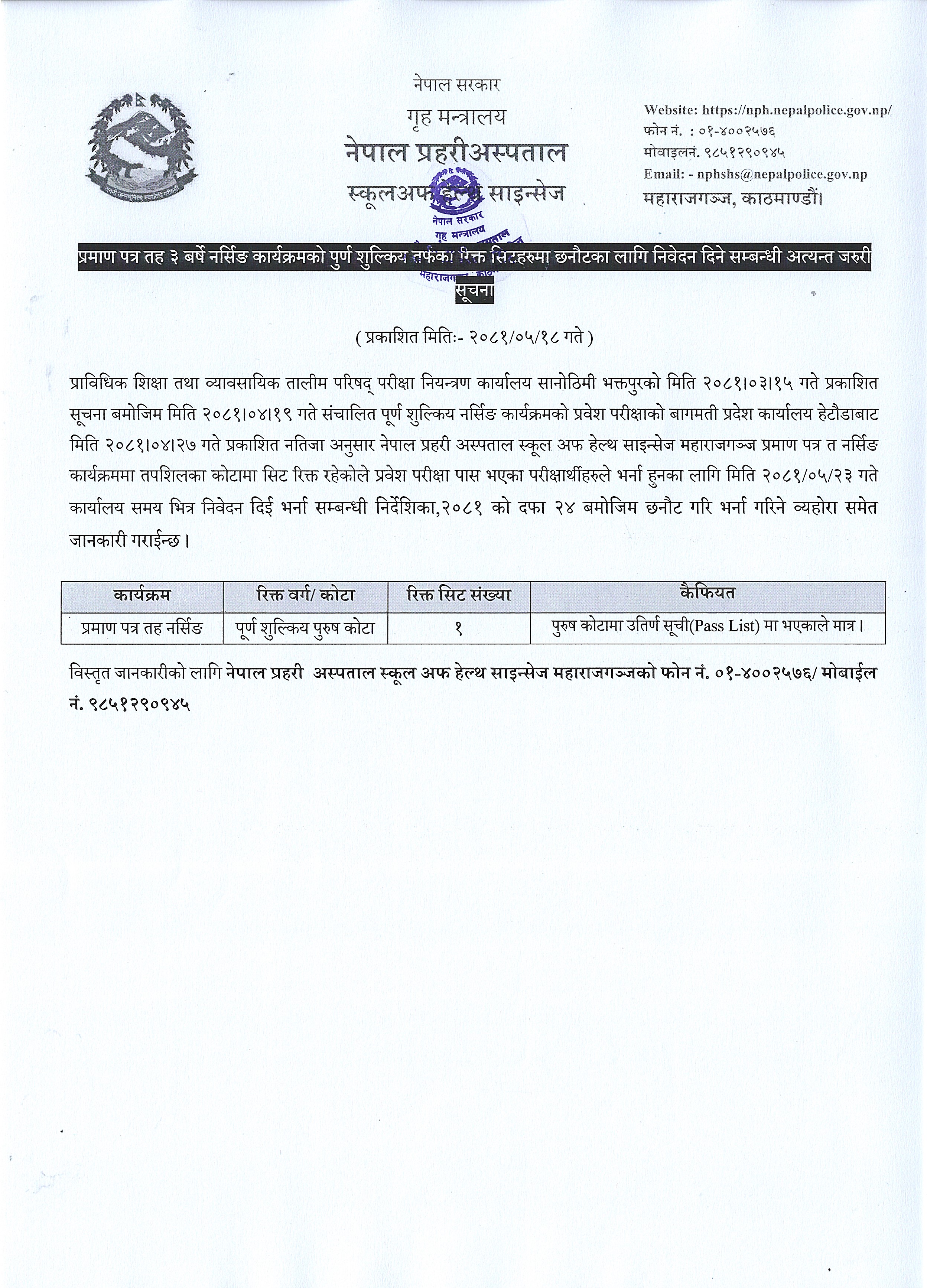 प्रमाण पत्र तह ३ बर्षे नर्सिङ कार्यक्रमको पुर्ण शुल्किय पुरुष कोटा तर्पका रिक्त सिटमा छनौटका लागि निवेदन दिने सम्बन्धी अत्यन्त जरुरी सूचना । २०८१/०५/१८ गते 2081-05-18 A A- A+ Share