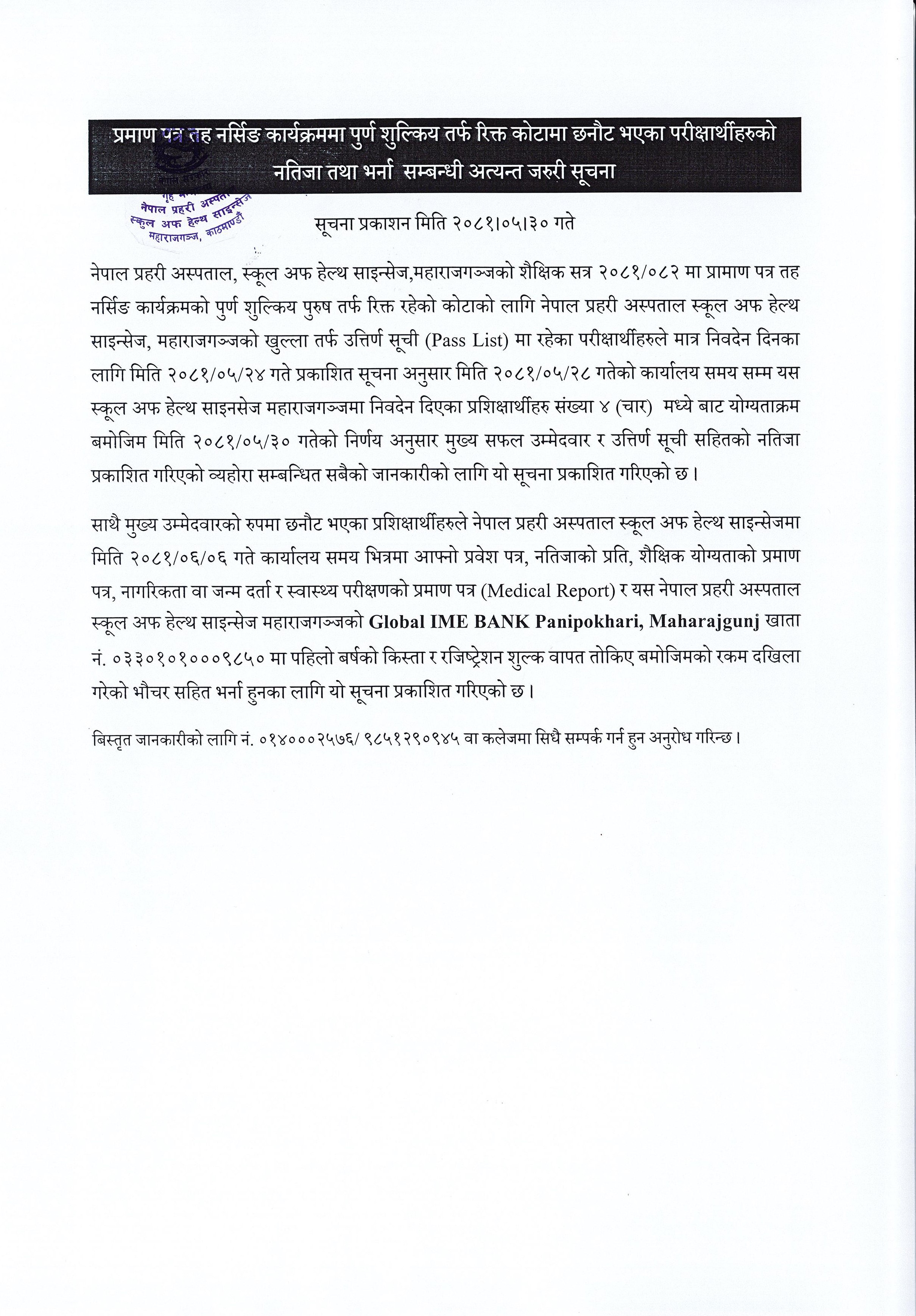 प्रमाण पत्र तह नर्सिङ कार्यक्रममा पुर्ण शुल्किय तर्फ रिक्त कोटामा छनौट भएका परीक्षार्थीहरुको नतिजा तथा भर्ना सम्बन्धी अत्यन्त जरुरी सूचना । २०८१/०५/३० गते 2081-05-30 A A- A+ Share