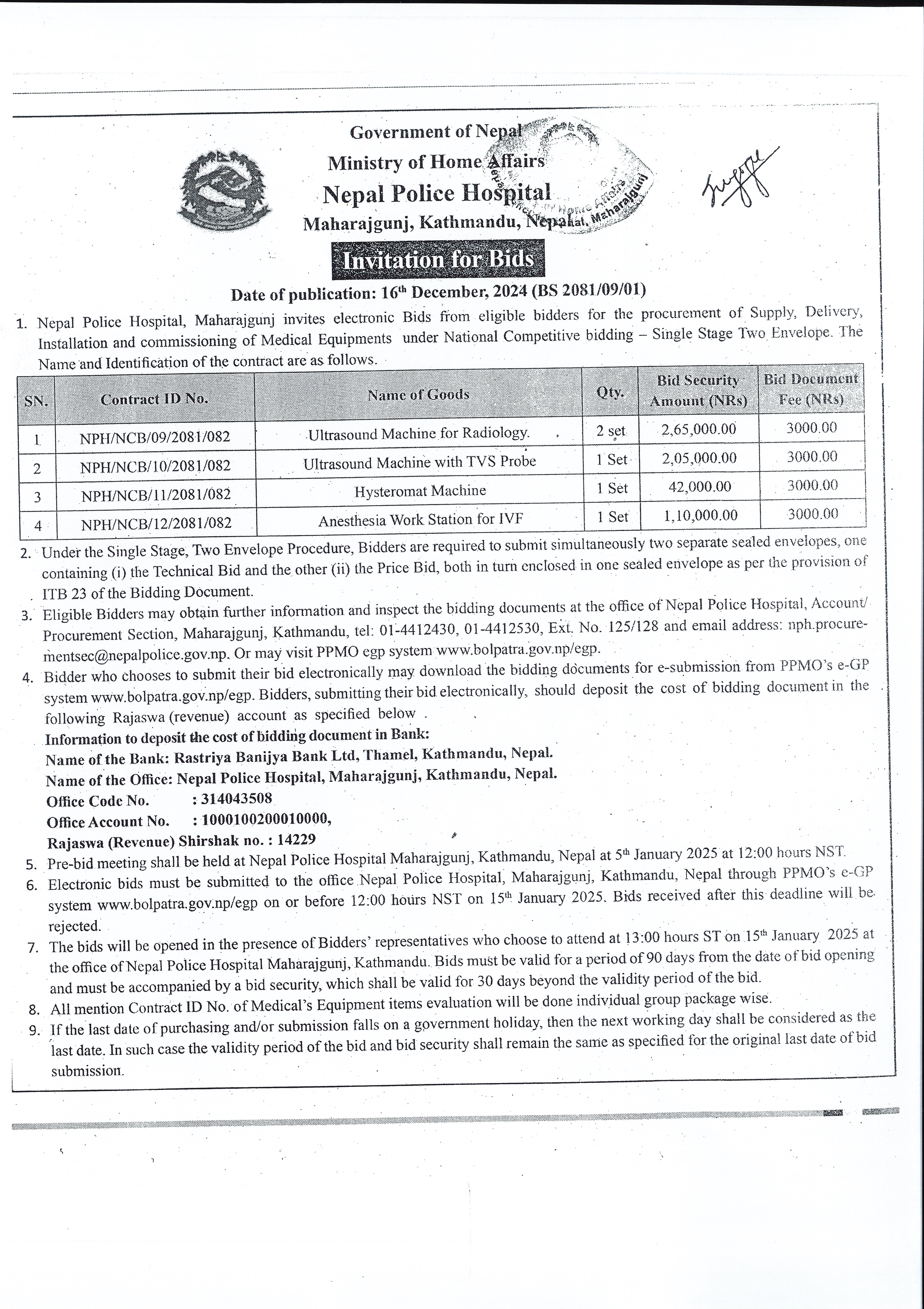 Invitation for Bids (बोलपत्र आव्हानको सुचना) मिति २०८१।०९।०१