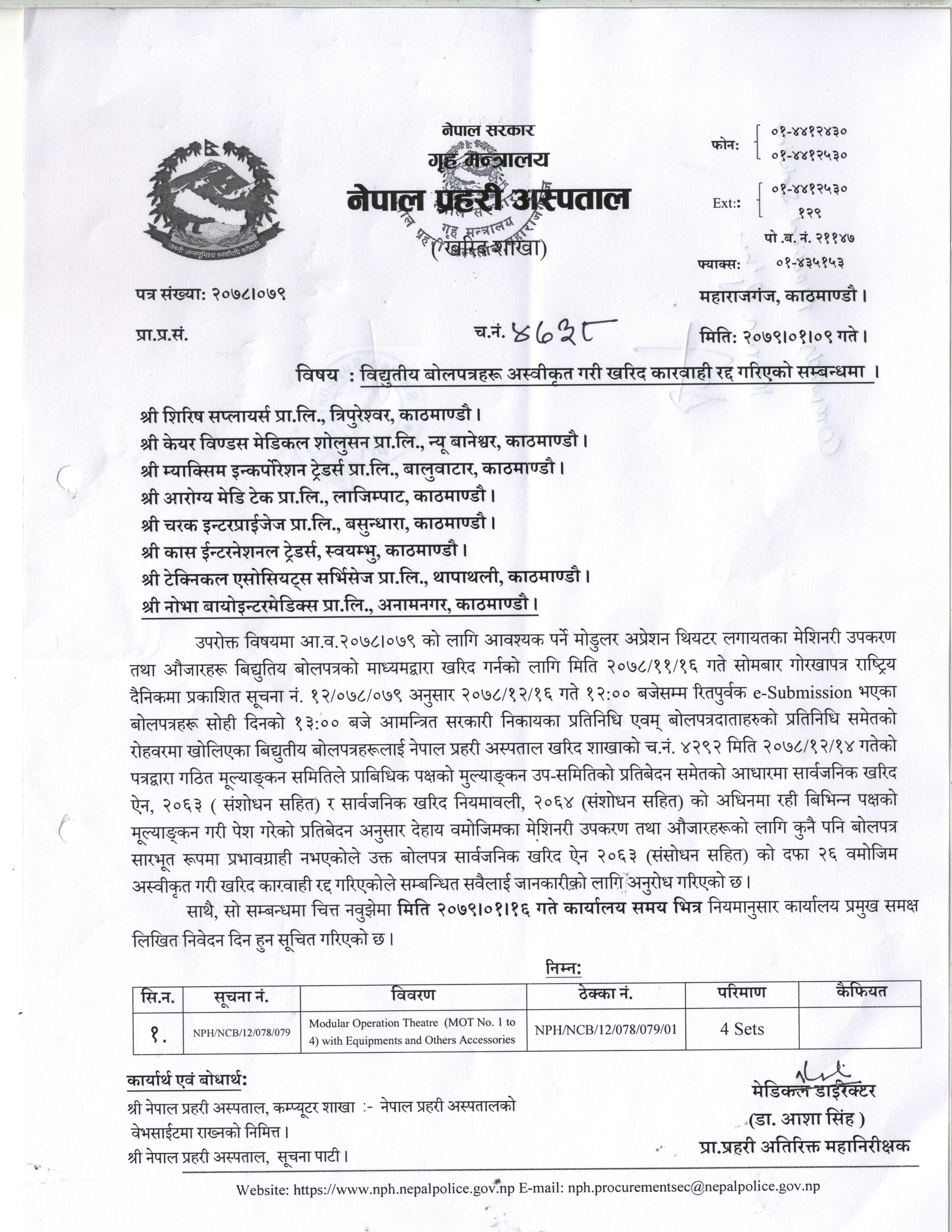 विद्युतीय बोलपत्र अस्वीकृत गरी खरिद कारवाही रद्द गरिएको सम्बन्धमा – २०७८-०१-०९ 2079-01-09 A A- A+ Share